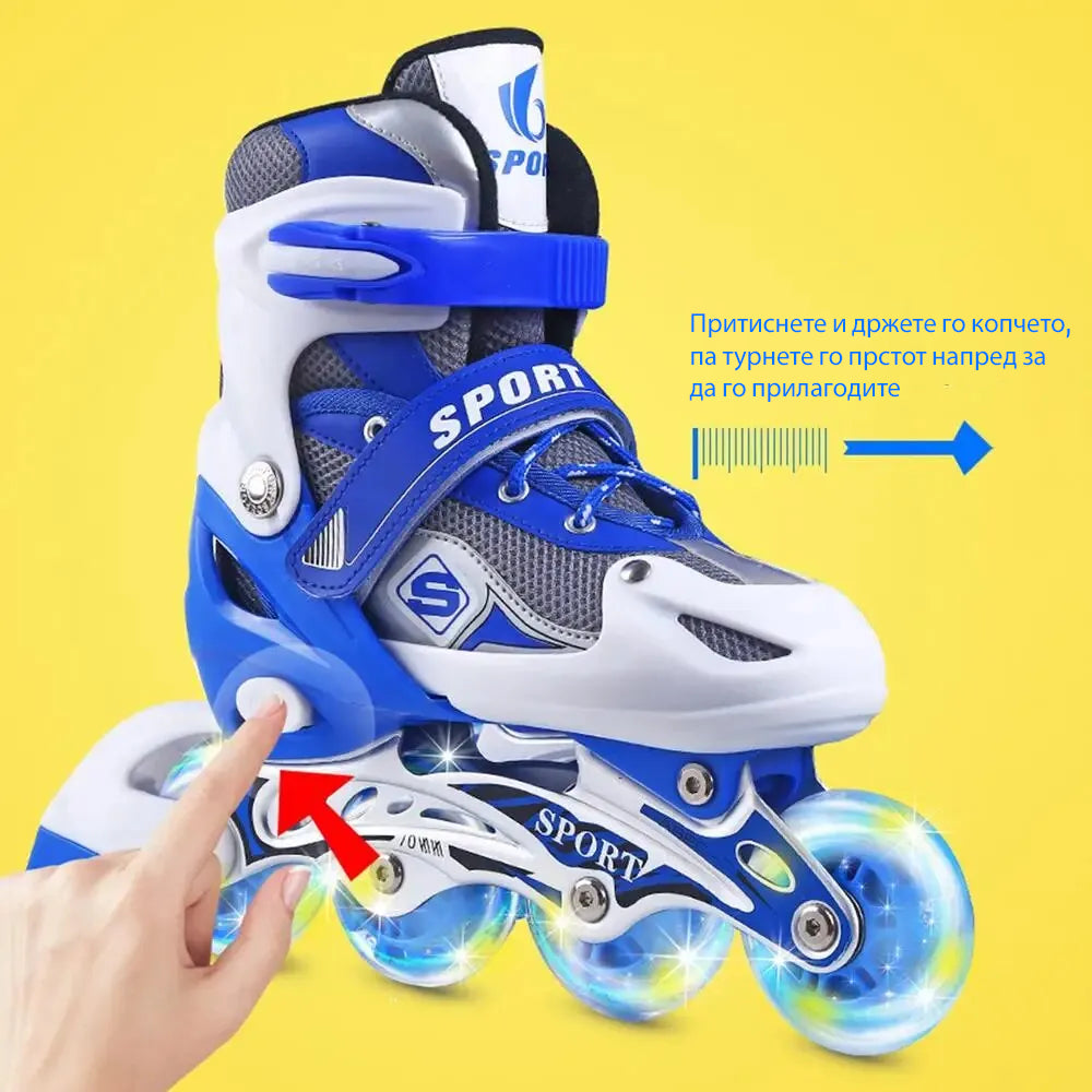 - Ролерите имаат задна сопирачка, стабилна конструкција на 4 тркалца и систем за лесно затегнување со ремче и лепенка.