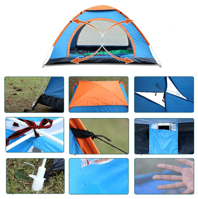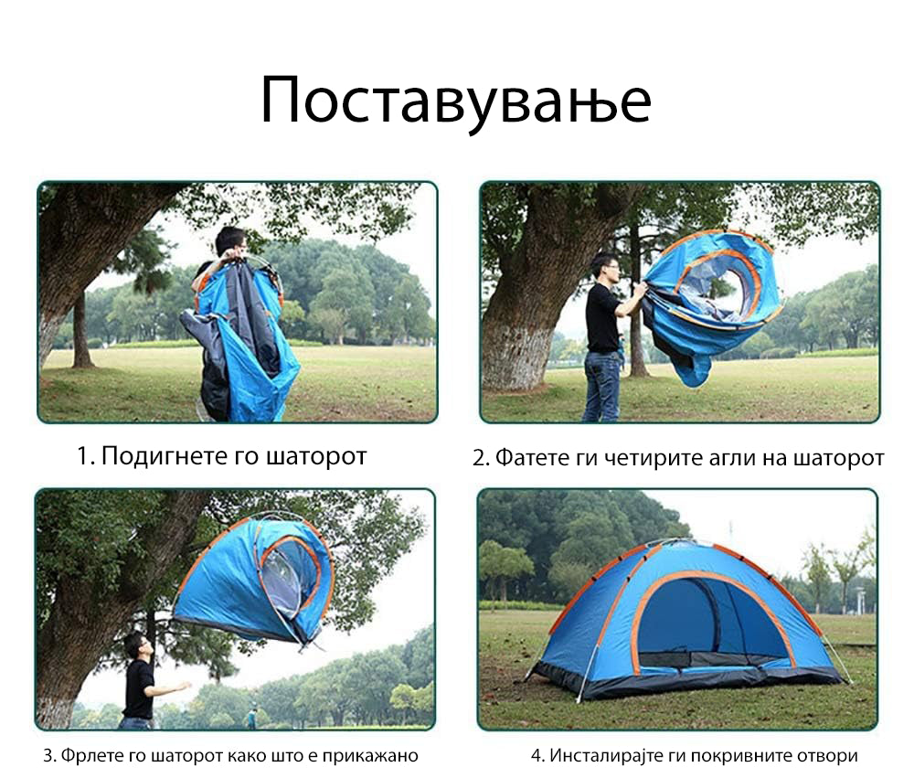 Овој шатор е лесен за монтажа и демонтажа, што го прави идеален за кратки кампувања или за патувања. Со компактни димензии и лесна за носење торба, можете лесно да го носите шаторот со вас каде и да одите.