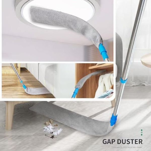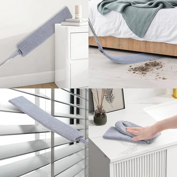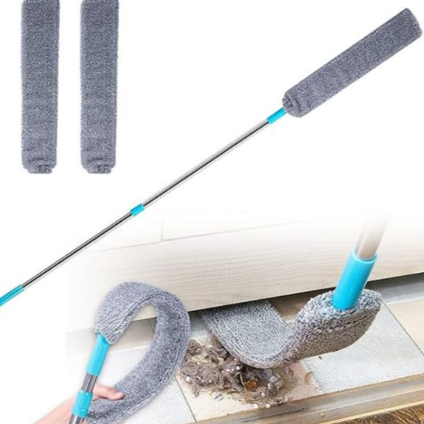 Главата на бришачот е изработена од свитлив материјал што лесно се обликува, за да можете да исчистите дури и најнедостапни места – зад шкаф, помеѓу радијатори, под кревет или околу клима уред. Меката микрофибра нежно прилега на површините и ефикасно ја собира правта без да ги оштети.